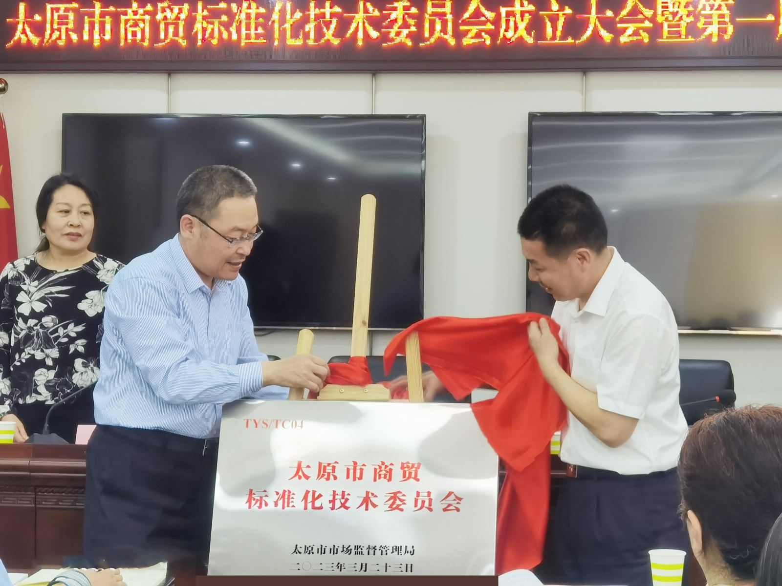 會(huì)上,夏文武介紹參會(huì)人員及商貿(mào)標(biāo)委會(huì)籌建情況,褚鮮萍宣讀了《關(guān)于成立太原市商貿(mào)標(biāo)準(zhǔn)化技術(shù)委員會(huì)的批復(fù)》。夏文武和趙勇共同為太原市商貿(mào)標(biāo)準(zhǔn)化技術(shù)委員會(huì)進(jìn)行了揭牌;與會(huì)領(lǐng)導(dǎo)為委員代表頒發(fā)了聘書(shū)。