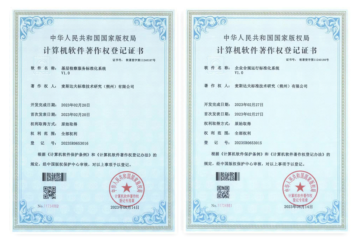 2023年6月16日,麥斯達(dá)夫標(biāo)準(zhǔn)技術(shù)研究 (朔州)有限公司獲得四項軟件著作權(quán)證書,“基層檢察服務(wù)標(biāo)準(zhǔn)化系統(tǒng)V1.0”“企業(yè)合規(guī)運行標(biāo)準(zhǔn)化系統(tǒng)V1.0”“合規(guī)風(fēng)險評估系統(tǒng)V1.0”“安全生產(chǎn)標(biāo)準(zhǔn)化診斷系統(tǒng)V1.0”。