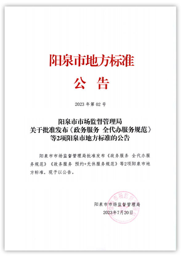 2023年7月20日,由麥斯達(dá)夫標(biāo)準(zhǔn)化服務(wù)(山西)有限公司、陽泉市郊區(qū)行政審批服務(wù)管理局共同研制的兩項(xiàng)陽泉市地方標(biāo)準(zhǔn)《政務(wù)服務(wù) 全代辦服務(wù)規(guī)范》《政務(wù)服務(wù) 預(yù)約+無休服務(wù)規(guī)范》正式獲批發(fā)布。