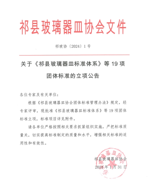 2024年1月31日,祁縣玻璃器皿協(xié)會(huì)發(fā)布關(guān)于《祁縣玻璃器皿標(biāo)準(zhǔn)體系》等19項(xiàng)團(tuán)體標(biāo)準(zhǔn)的立項(xiàng)公告。
