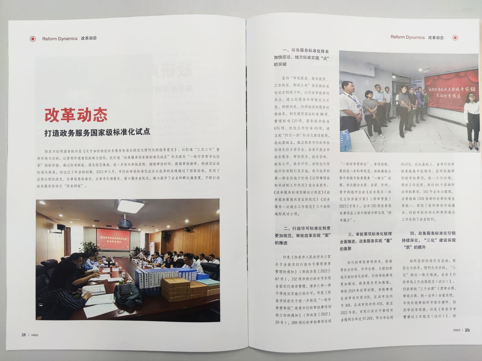 近日,由陽泉市行政審批服務(wù)管理局供稿的《改革動態(tài)——打造政務(wù)服務(wù)國家級標(biāo)準(zhǔn)化試點》在《陽泉工作》2024年第一期刊登。
