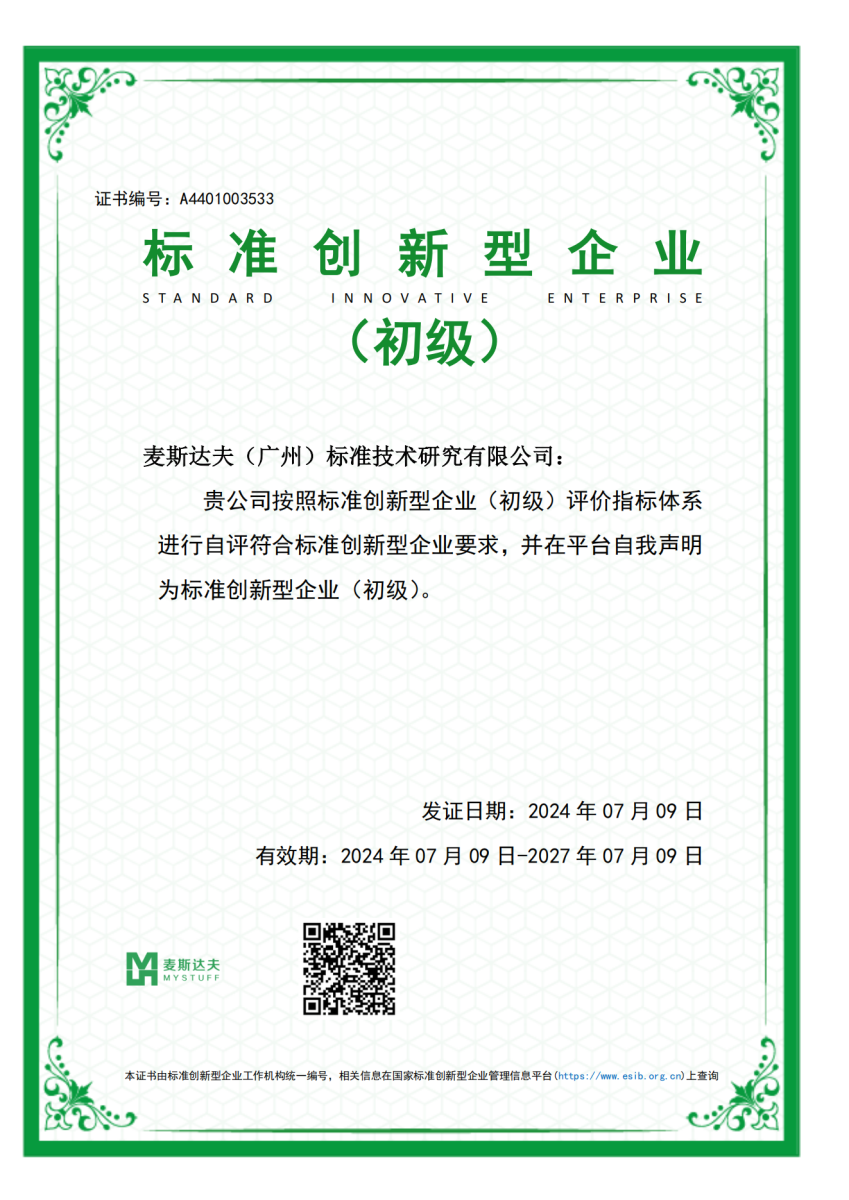 2024年7月9日,麥斯達(dá)夫(廣州)標(biāo)準(zhǔn)技術(shù)研究有限公司獲評標(biāo)準(zhǔn)創(chuàng)新型企業(yè)(初級)。