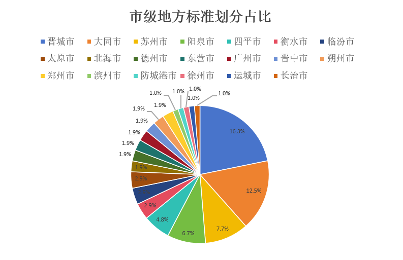 從省級(jí)行政區(qū)域來(lái)看,廣東、江蘇、山東、河南、河北、山西、廣西、吉林、海南等八個(gè)?。ㄗ灾螀^(qū))均有涉及。從市級(jí)行政區(qū)域來(lái)看,晉城市地方標(biāo)準(zhǔn)17項(xiàng),占比16.3%;大同市地方標(biāo)準(zhǔn)13項(xiàng),占比12.5%;蘇州市地方標(biāo)準(zhǔn)8項(xiàng),占比7.7%;陽(yáng)泉市地方標(biāo)準(zhǔn)7項(xiàng),占比6.7%;四平市地方標(biāo)準(zhǔn)5項(xiàng),占比4.8%。此外,衡水、太原、臨汾各3項(xiàng),廣州、鄭州、北海、德州、東營(yíng)、晉中、朔州各2項(xiàng);徐州、濱州、防城港、長(zhǎng)治、運(yùn)城各1項(xiàng)。