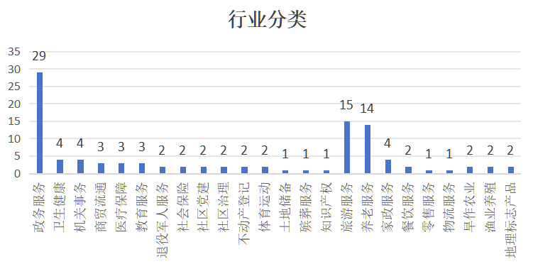 按照行業(yè)領(lǐng)域劃分,社會(huì)事業(yè)領(lǐng)域的地方標(biāo)準(zhǔn)61項(xiàng),占比58.7%;服務(wù)業(yè)領(lǐng)域的地方標(biāo)準(zhǔn)37項(xiàng),占比35.6%;農(nóng)業(yè)領(lǐng)域的地方標(biāo)準(zhǔn)6項(xiàng),占比5.8%。從行業(yè)分類來(lái)看,政務(wù)服務(wù)29項(xiàng)、衛(wèi)生健康4項(xiàng)、機(jī)關(guān)事務(wù)4項(xiàng)、商貿(mào)流通3項(xiàng)、醫(yī)療保障3項(xiàng)、教育服務(wù)3項(xiàng)、退役軍人服務(wù)2項(xiàng)、社會(huì)保險(xiǎn)2項(xiàng)、社區(qū)黨建2項(xiàng)、社區(qū)治理2項(xiàng)、不動(dòng)產(chǎn)登記2項(xiàng)、體育運(yùn)動(dòng)2項(xiàng)、土地儲(chǔ)備1項(xiàng)、殯葬服務(wù)1項(xiàng)、知識(shí)產(chǎn)權(quán)1項(xiàng);旅游服務(wù)15項(xiàng)、養(yǎng)老服務(wù)14項(xiàng)、家政服務(wù)4項(xiàng)、餐飲服務(wù)2項(xiàng),零售服務(wù)、物流服務(wù)各1項(xiàng);旱作農(nóng)業(yè)2項(xiàng)、漁業(yè)養(yǎng)殖2項(xiàng)、地理標(biāo)志產(chǎn)品2項(xiàng)。