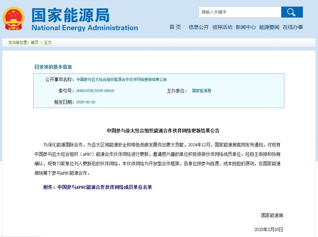 為深化能源國際合作,為亞太區(qū)域能源安全和綠色低碳發(fā)展作出更大貢獻(xiàn),2024年12月,國家能源局官網(wǎng)發(fā)布通知,對現(xiàn)有中國參與亞太經(jīng)合組織(APEC)能源合作伙伴網(wǎng)絡(luò)進(jìn)行更新,邀請感興趣的單位積極申報(bào)伙伴網(wǎng)絡(luò)成員單位。經(jīng)自主申報(bào)和協(xié)商確認(rèn),現(xiàn)有73家單位列入更新后的伙伴網(wǎng)絡(luò)。本伙伴網(wǎng)絡(luò)為開放型合作框架,各單位按參與自愿、成本自擔(dān)的原則,在國家能源局統(tǒng)籌下參與APEC能源合作。