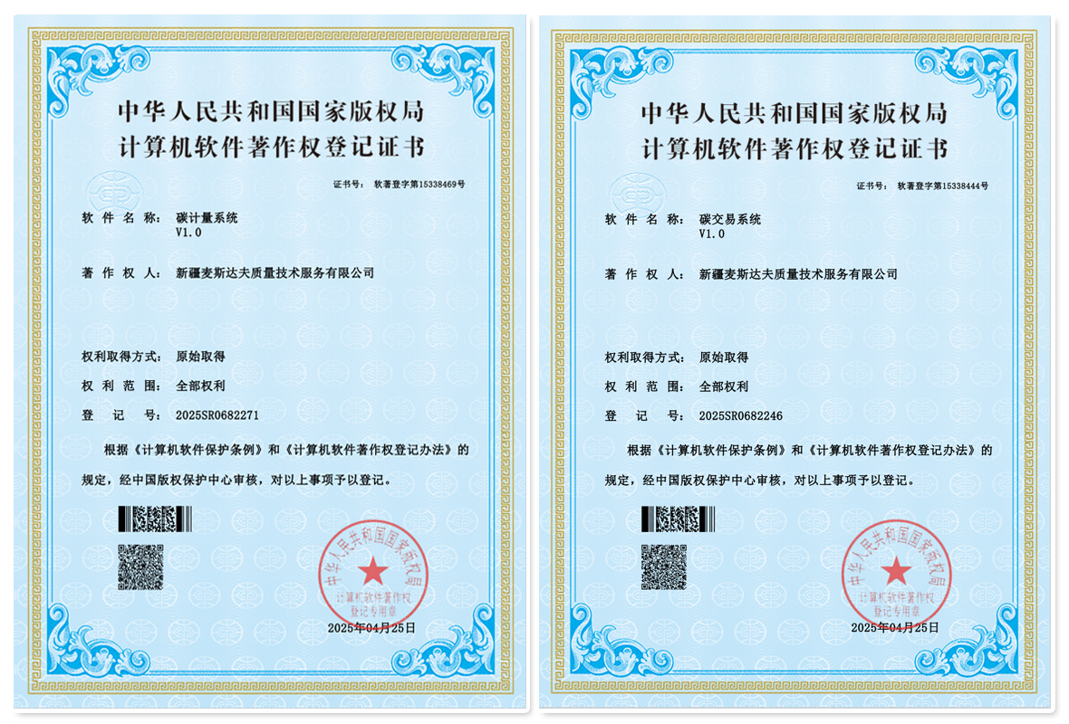 2025年4月25日,新疆麥斯達(dá)夫質(zhì)量技術(shù)服務(wù)有限公司獲批兩項(xiàng)軟件著作權(quán)證書,“碳計(jì)量系統(tǒng)V1.0”和“碳交易系統(tǒng)V1.0”。