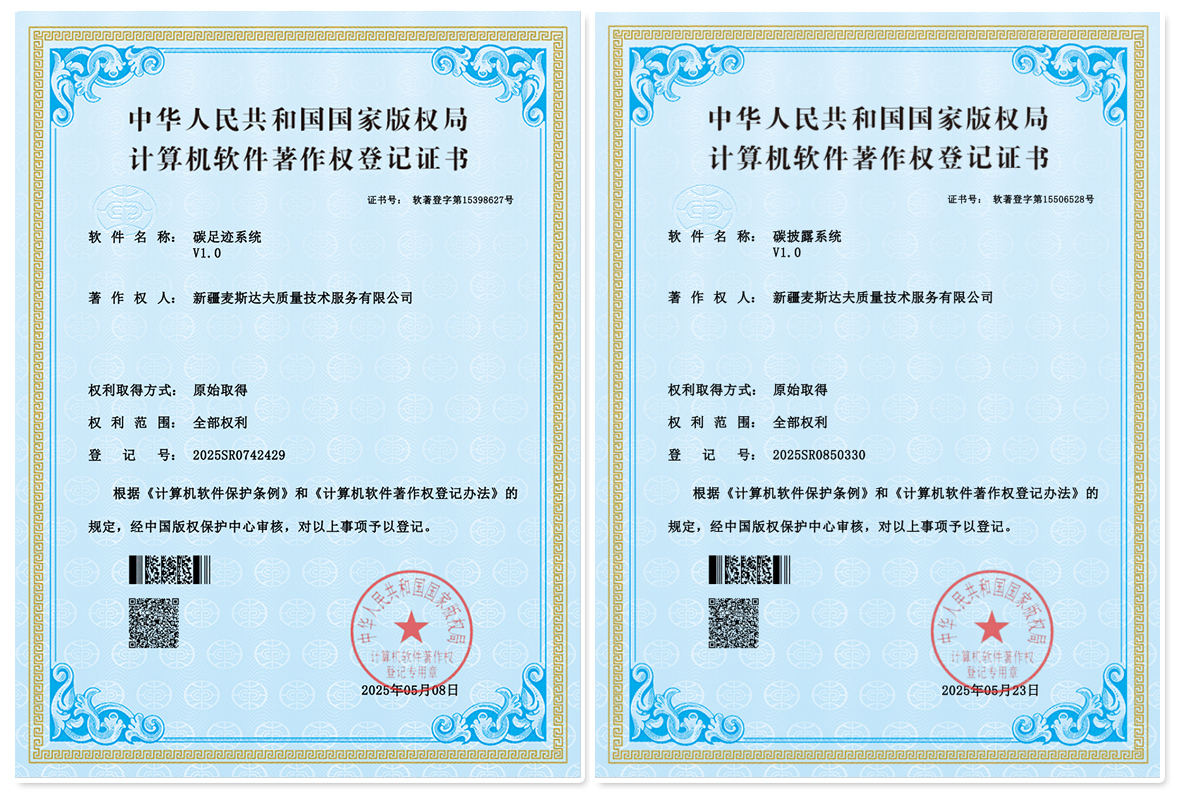 2025年4-5月,新疆麥斯達(dá)夫質(zhì)量技術(shù)服務(wù)有限公司先后獲批“碳監(jiān)測(cè)系統(tǒng)V1.0”“碳分析系統(tǒng)V1.0”“碳計(jì)量系統(tǒng)V1.0”“碳交易系統(tǒng)V1.0”“碳足跡系統(tǒng)V1.0”“碳披露系統(tǒng)V1.0”等六項(xiàng)雙碳領(lǐng)域軟件著作權(quán),實(shí)現(xiàn)雙碳技術(shù)服務(wù)全鏈條知識(shí)產(chǎn)權(quán)完整布局。