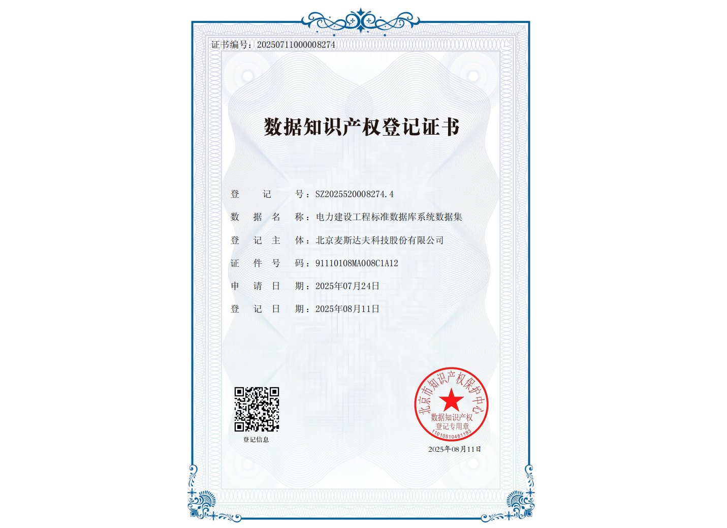 2025年8月11日,麥斯達(dá)夫集團(tuán)在數(shù)據(jù)知識產(chǎn)權(quán)保護(hù)領(lǐng)域取得突破,旗下“電力建設(shè)工程標(biāo)準(zhǔn)數(shù)據(jù)庫系統(tǒng)數(shù)據(jù)集”成功獲批“數(shù)據(jù)知識產(chǎn)權(quán)登記證書”。這一成果不僅是對集團(tuán)在標(biāo)準(zhǔn)數(shù)字化領(lǐng)域深耕的肯定,也為能源行業(yè)數(shù)據(jù)資產(chǎn)的保護(hù)和應(yīng)用樹立了新標(biāo)桿。