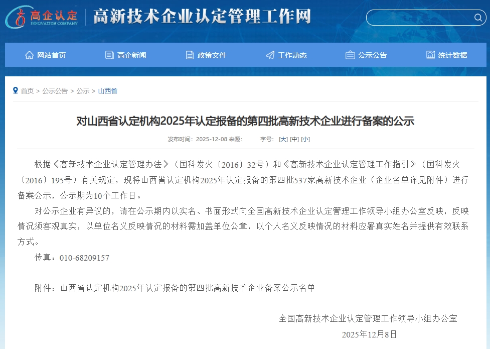 根據(jù)《高新技術(shù)企業(yè)認(rèn)定管理辦法》(國科發(fā)火〔2016〕32號)和《高新技術(shù)企業(yè)認(rèn)定管理工作指引》(國科發(fā)火〔2016〕195號)有關(guān)規(guī)定,山西省認(rèn)定機(jī)構(gòu)2025年認(rèn)定報備的第四批537家高新技術(shù)企業(yè)名單于2025年12月8日公示。麥斯達(dá)夫(山西)集團(tuán)有限公司榮耀位列其中,繼北京總部、深圳公司、廣州公司、天津公司之后,成為麥斯達(dá)夫集團(tuán)旗下第五家國家高新技術(shù)企業(yè)。