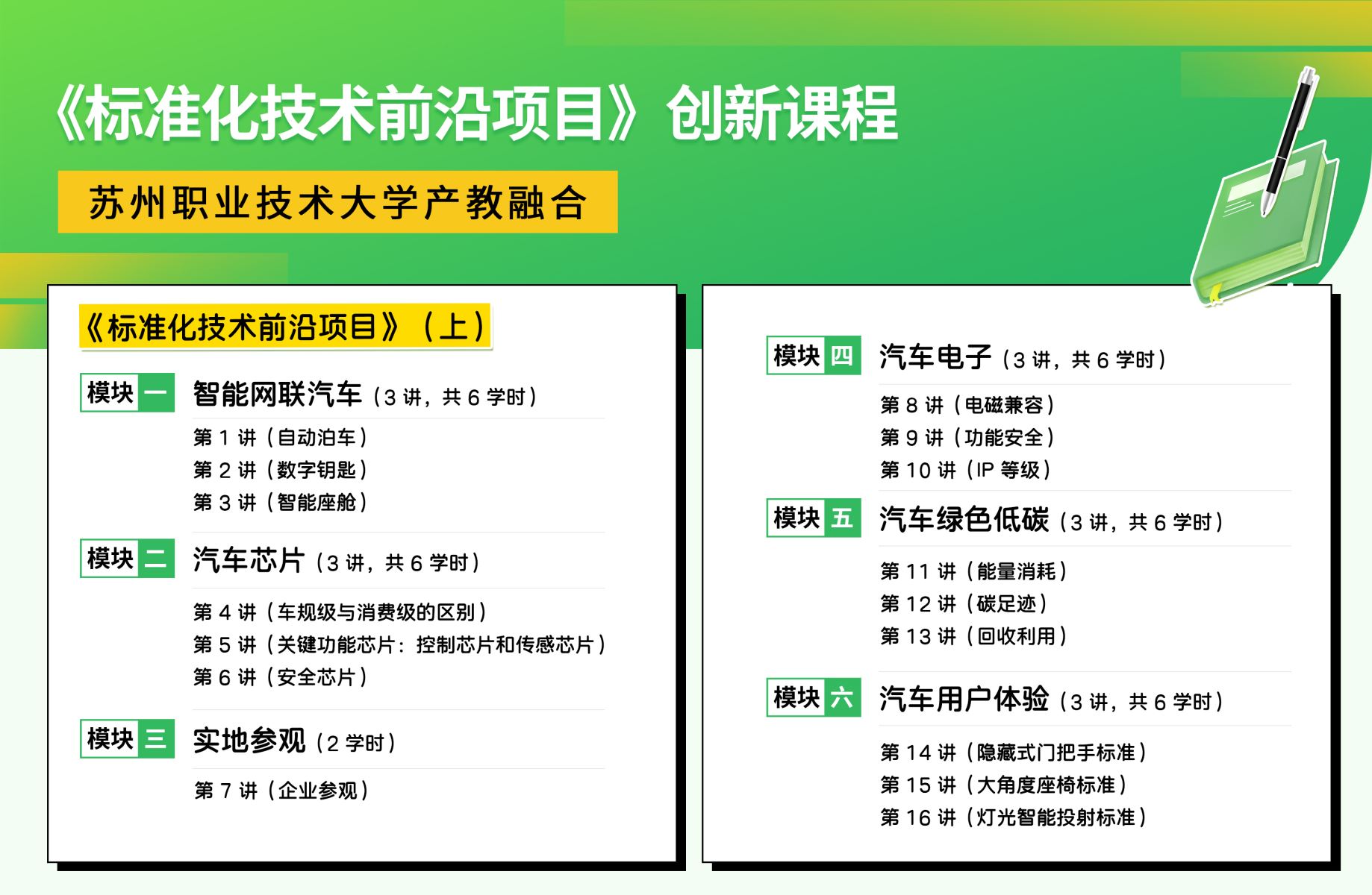 《標(biāo)準(zhǔn)化技術(shù)前沿項目》課程共設(shè)32講、64課時,自本學(xué)期起正式納入蘇州職業(yè)技術(shù)大學(xué)機電工程學(xué)院“汽車標(biāo)準(zhǔn)化技術(shù)”微專業(yè)核心課程體系。麥斯達夫集團全面負(fù)責(zé)課程的教學(xué)實施,包括授課師資配備、課件教材開發(fā)、實訓(xùn)教具準(zhǔn)備、課程標(biāo)準(zhǔn)制定、課后習(xí)題組編、線上微課錄制和考核體系設(shè)計等環(huán)節(jié),全方位保障課程質(zhì)量和教學(xué)效果。