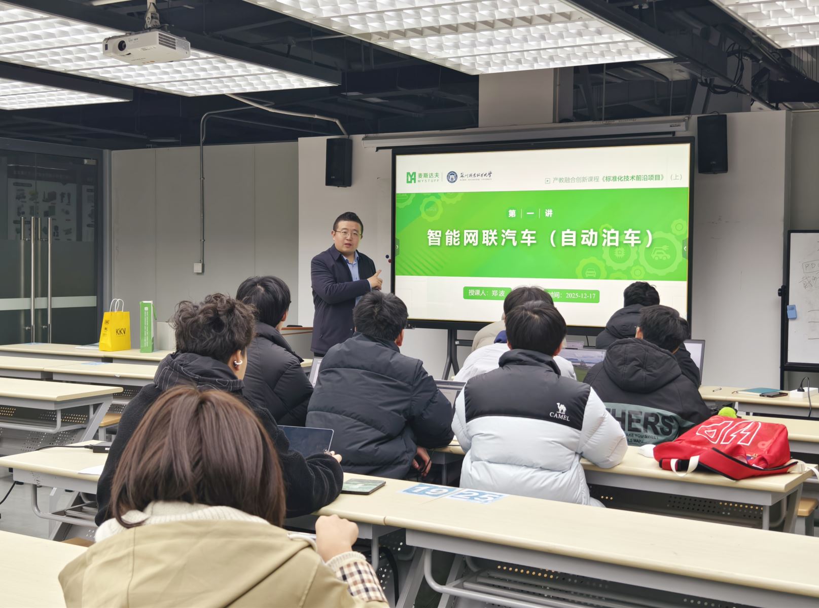 2025年12月17日,蘇州職業(yè)技術(shù)大學(xué)和麥斯達夫集團校企合作共建的微專業(yè)“汽車標(biāo)準(zhǔn)化技術(shù)”核心課程——《標(biāo)準(zhǔn)化技術(shù)前沿項目》正式開課。該課程由麥斯達夫集團創(chuàng)始人、首席執(zhí)行官鄭波擔(dān)任特聘教師,面向機電工程學(xué)院新能源汽車技術(shù)、機電一體化技術(shù)兩個專業(yè)的二年級學(xué)生授課。此次開課標(biāo)志著雙方在汽車標(biāo)準(zhǔn)化領(lǐng)域的人才培養(yǎng)步入常態(tài)化、系統(tǒng)化教學(xué)新階段。