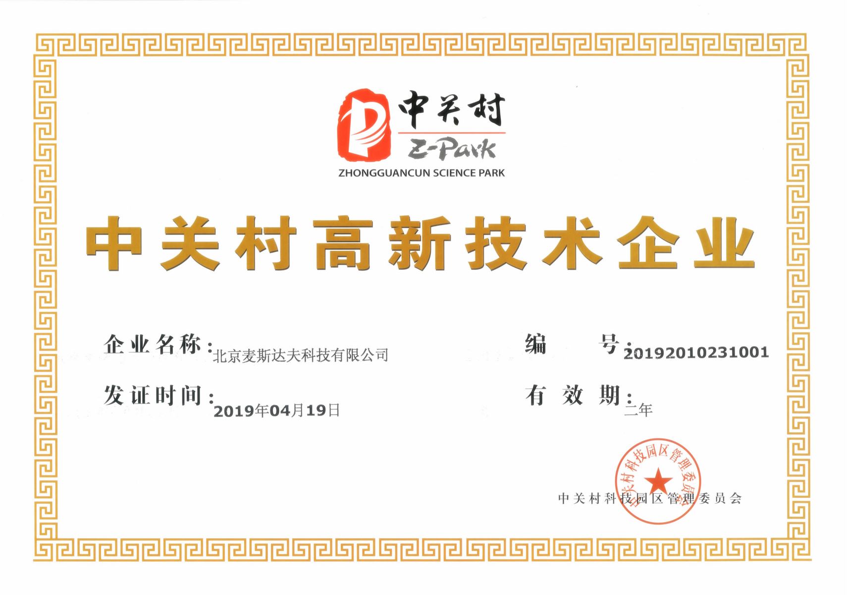 2019年4月19日,北京麥斯達(dá)夫科技有限公司獲批“中關(guān)村高新技術(shù)企業(yè)”稱號(hào),認(rèn)定類(lèi)型為高技術(shù)服務(wù)業(yè)企業(yè)。