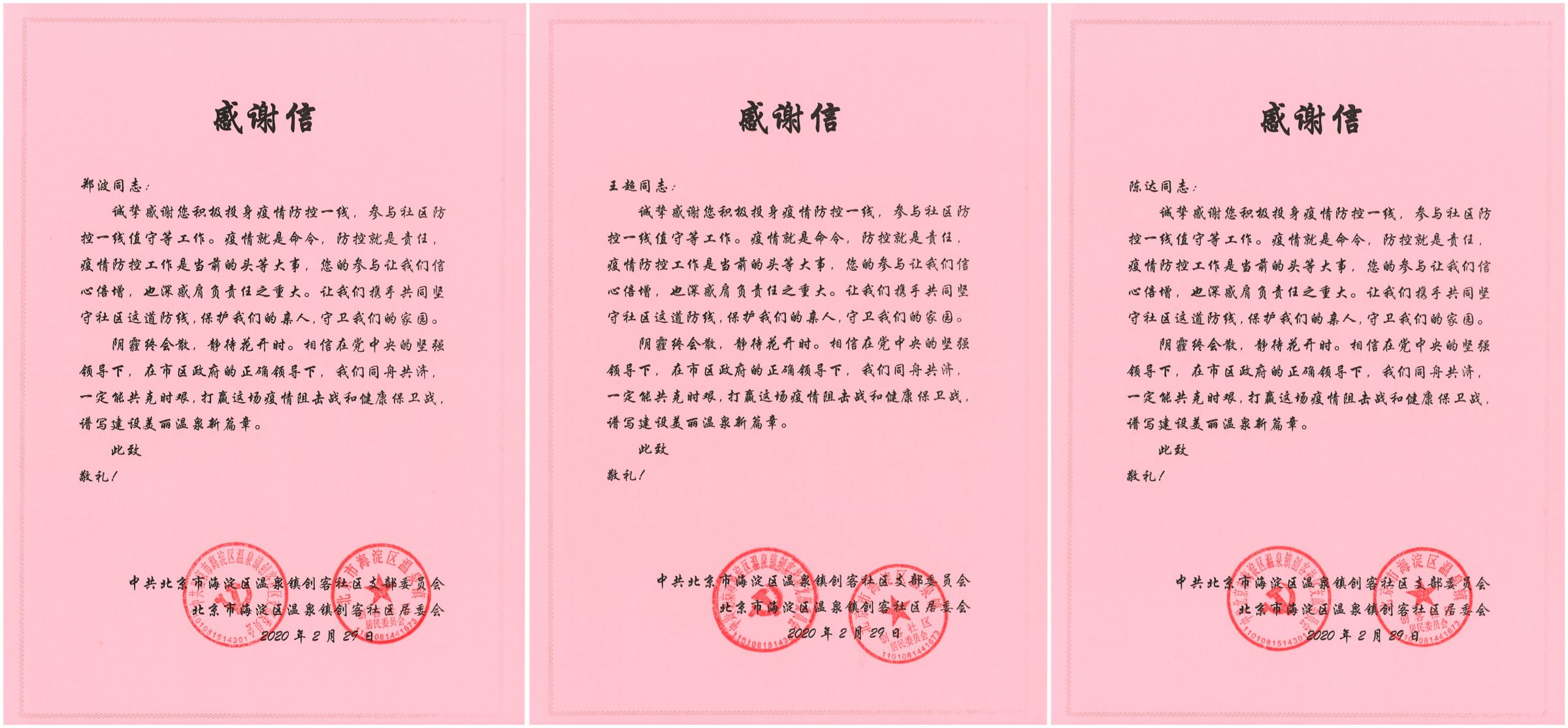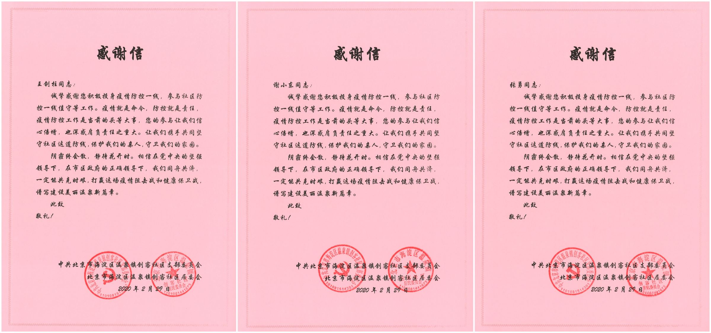 2020年3月1日,北京市海淀區(qū)中關(guān)村創(chuàng)客小鎮(zhèn)社區(qū)向麥斯達(dá)夫“標(biāo)兵共產(chǎn)黨員服務(wù)隊(duì)”贈(zèng)送感謝信。