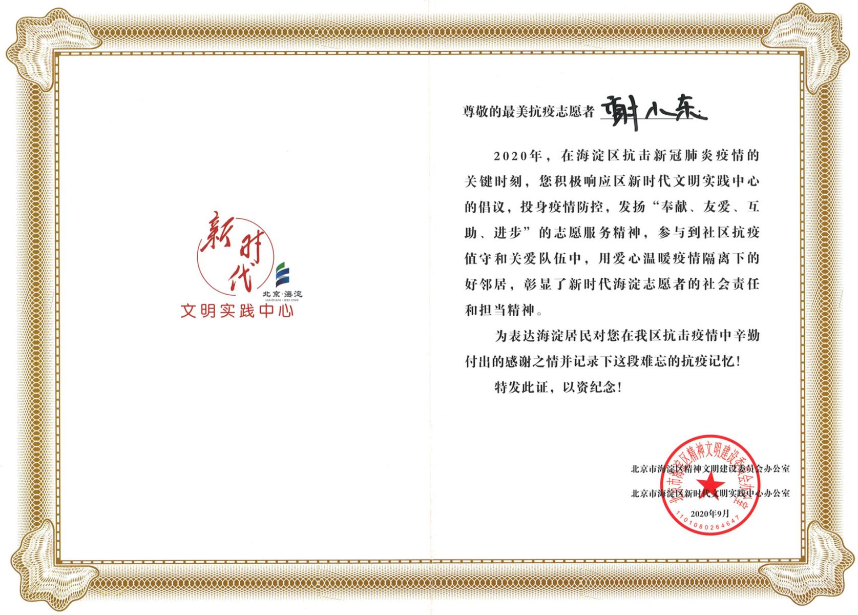 為深入貫徹習(xí)近平總書記關(guān)于堅決打贏疫情防控阻擊戰(zhàn)的重要指示精神,進(jìn)一步關(guān)心激勵疫情防控人員,7月,海淀區(qū)新時代文明實踐中心開啟了第二批"最美抗疫志愿者"征集活動,經(jīng)過廣大人民群眾的推選點贊,共產(chǎn)生674位“最美抗疫志愿者”。麥斯達(dá)夫“標(biāo)兵共產(chǎn)黨員服務(wù)隊”隊員王超、謝小東、陳達(dá)獲評海淀區(qū)“最美抗疫志愿者”榮譽稱號。