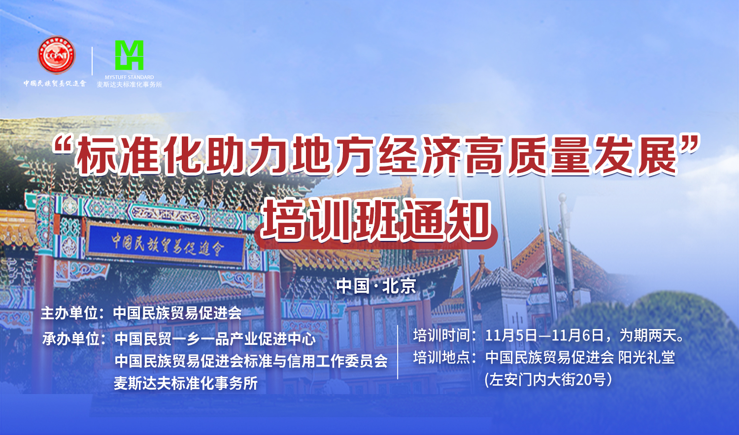 為進(jìn)一步提升中國一鄉(xiāng)一品標(biāo)準(zhǔn)化品牌價值,順利推動標(biāo)準(zhǔn)化工作的落地,有效服務(wù)一鄉(xiāng)一品特色產(chǎn)業(yè)質(zhì)量提升,中國民族貿(mào)易促進(jìn)會決定舉辦“標(biāo)準(zhǔn)化助力地方經(jīng)濟(jì)高質(zhì)量發(fā)展”培訓(xùn)班?,F(xiàn)將有關(guān)事宜通知如下: