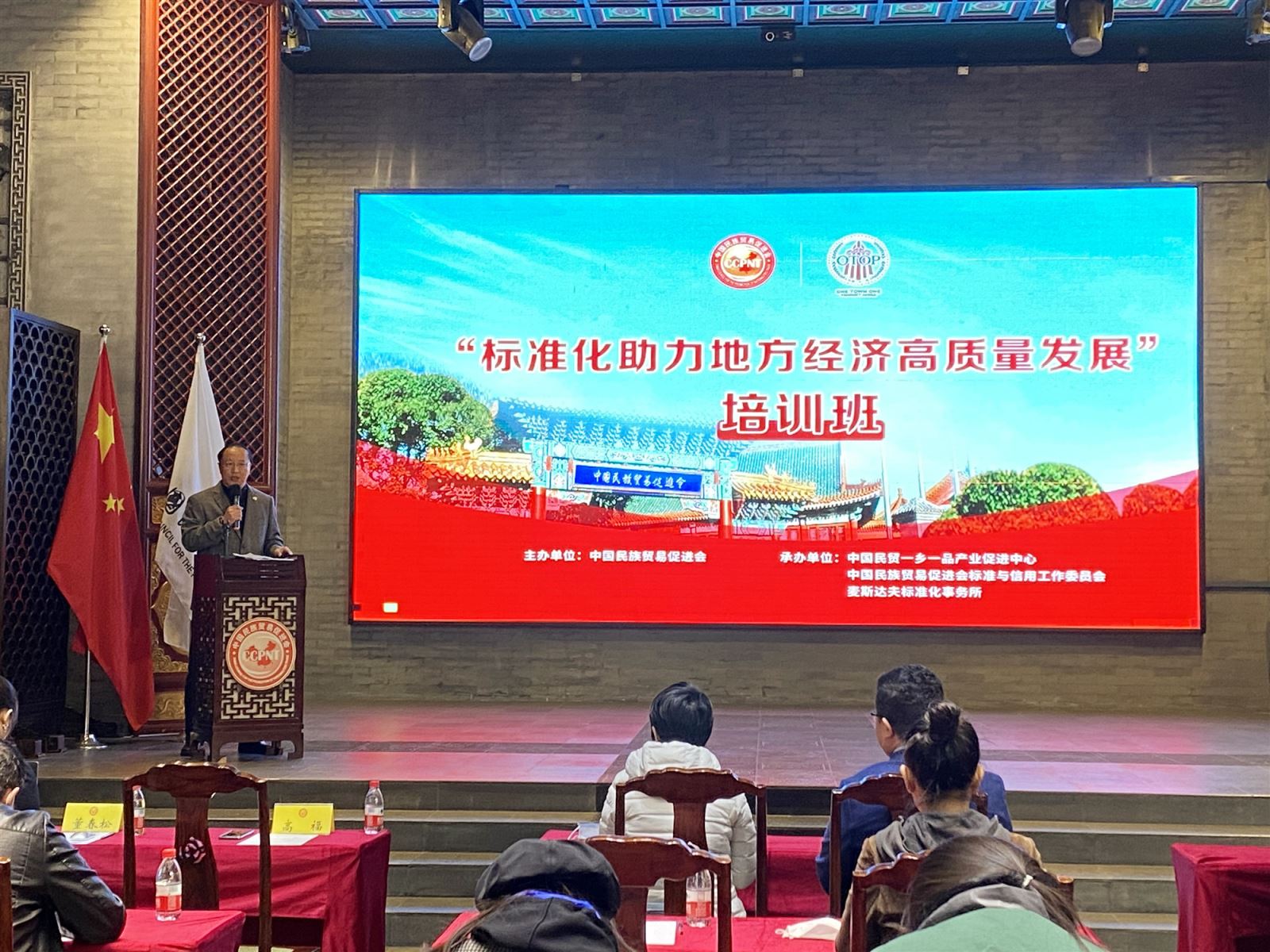 2020年11月5日,由中國民族貿易促進會主辦,中國民貿一鄉(xiāng)一品產業(yè)促進中心、中國民族貿易促進會標準與信用工作委員會、麥斯達夫標準化事務所承辦的“標準化助力地方經濟高質量發(fā)展”培訓班在中國民族貿易促進會陽光禮堂舉辦。來自河北、內蒙、黑龍江、海南等全國多個?。ㄊ校┑臉藴驶瘡臉I(yè)者及企業(yè)代表三十余人參加此次培訓。培訓由中國民族貿易促進會標準與信用工作委員會負責人董春松主持。