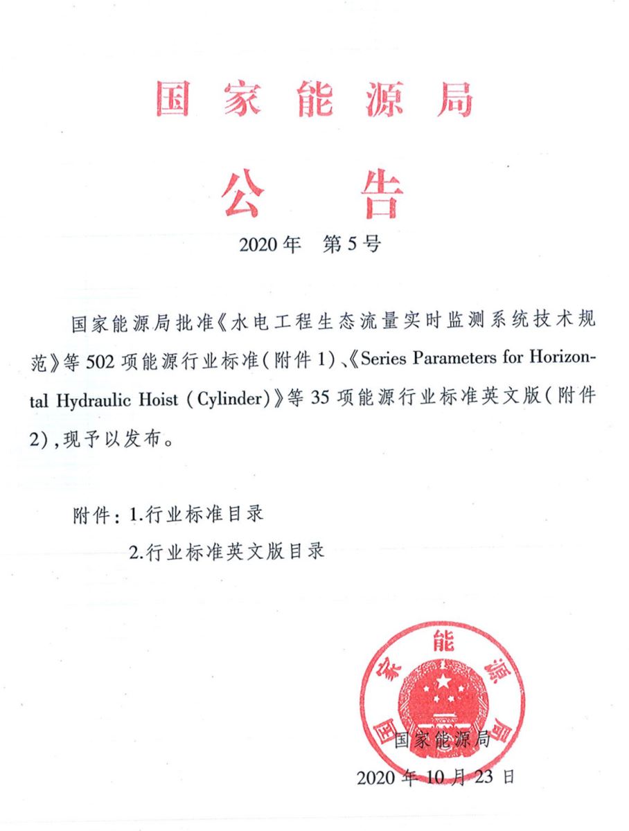 2020年10月28日,國(guó)家能源局發(fā)布2020年第5號(hào)公告,批準(zhǔn)發(fā)布《水電工程生態(tài)流量實(shí)時(shí)監(jiān)測(cè)系統(tǒng)技術(shù)規(guī)范》等502項(xiàng)能源行業(yè)標(biāo)準(zhǔn)以及《Series Parameters for Horizontal Hydraulic Hoist(Cylinder)》等35項(xiàng)能源行業(yè)標(biāo)準(zhǔn)英文版。