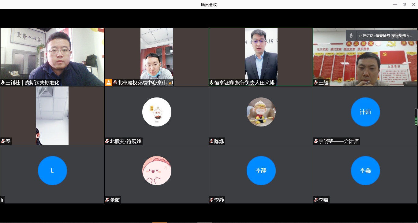 2021年1月19日,全國中小企業(yè)股份轉(zhuǎn)讓系統(tǒng)掛牌第一次輔導(dǎo)會(huì)以視頻會(huì)議形式召開。北京股權(quán)交易中心投資者與產(chǎn)品部負(fù)責(zé)人符展翊,恒泰長(zhǎng)財(cái)證券、海潤(rùn)天睿律師事務(wù)所、中興財(cái)光華會(huì)計(jì)事務(wù)所相關(guān)負(fù)責(zé)人員出席會(huì)議。麥斯達(dá)夫首席執(zhí)行官鄭波、首席運(yùn)營官王超、市場(chǎng)總監(jiān)王釗柱參加會(huì)議。會(huì)議由北京股權(quán)交易中心投資者與產(chǎn)品部高級(jí)經(jīng)理秦偉主持。