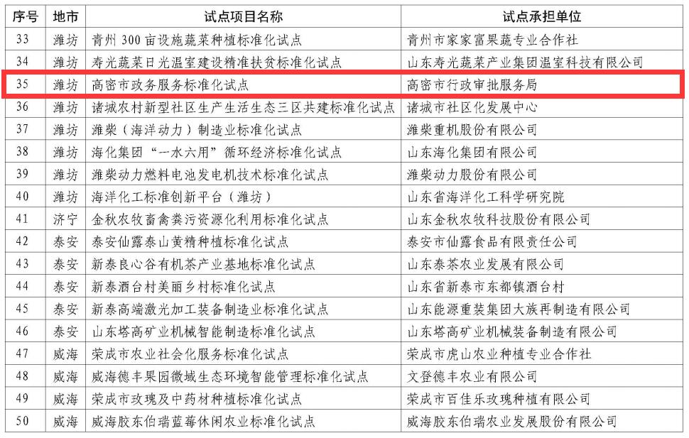 2021年3月12日,山東省市場監(jiān)督管理局發(fā)布關(guān)于山東濟(jì)華“藍(lán)帽子”燃?xì)夥?wù)標(biāo)準(zhǔn)化試點(diǎn)等115個省級標(biāo)準(zhǔn)化試點(diǎn)驗(yàn)收評估合格的通知。其中,麥斯達(dá)夫承擔(dān)的“高密市政務(wù)服務(wù)標(biāo)準(zhǔn)化試點(diǎn)”“五蓮政務(wù)服務(wù)標(biāo)準(zhǔn)化試點(diǎn)”兩個項目順利通過驗(yàn)收。