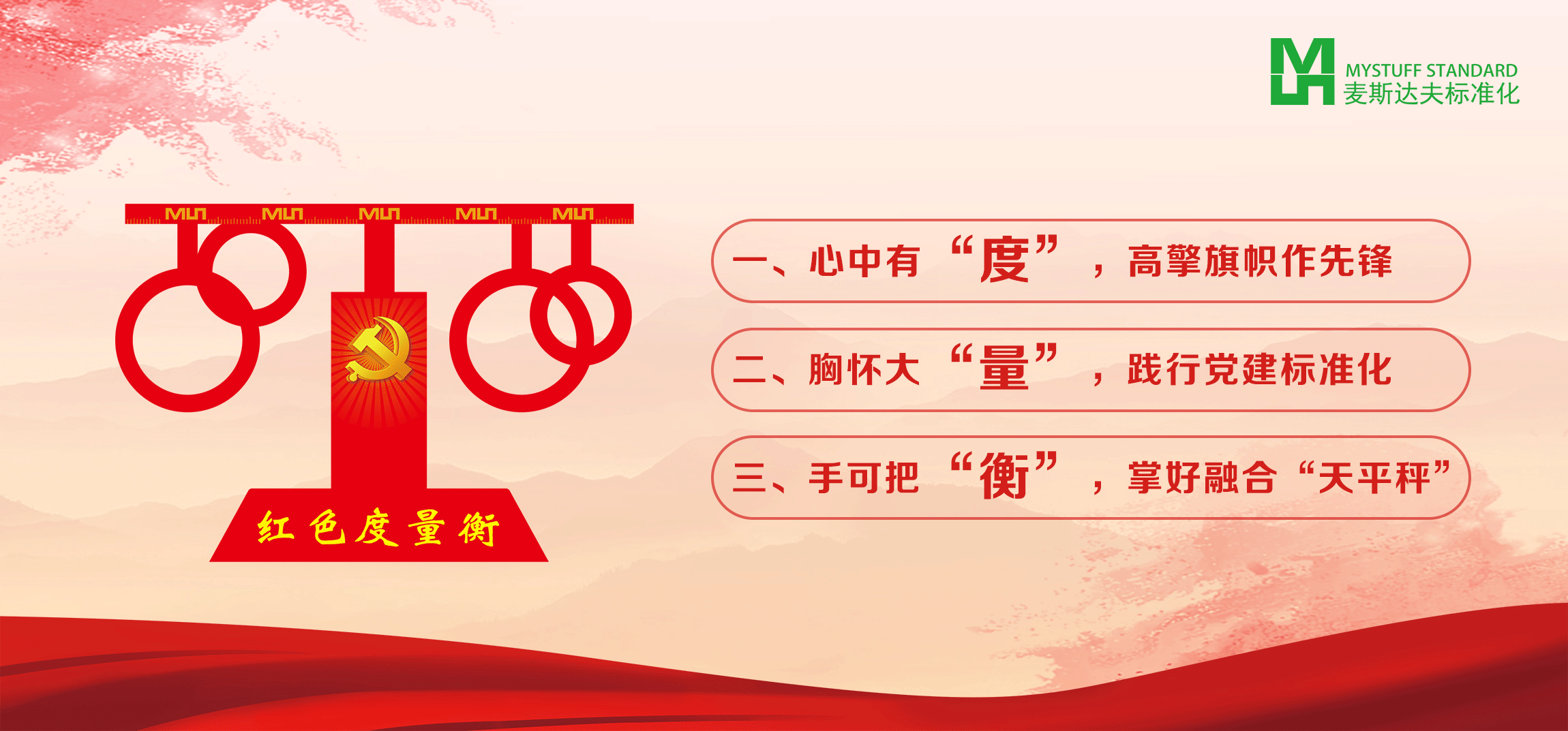 麥斯達(dá)夫黨支部以“紅色度量衡”作為公司黨建品牌,依托公司標(biāo)準(zhǔn)化技術(shù)優(yōu)勢(shì),結(jié)合公司特色黨建工作,打造心中有“度”,高擎旗幟作先鋒;胸懷大“量”,踐行黨建標(biāo)準(zhǔn)化;手可把“衡”,掌好融合“天平秤”的特色黨建品牌。
