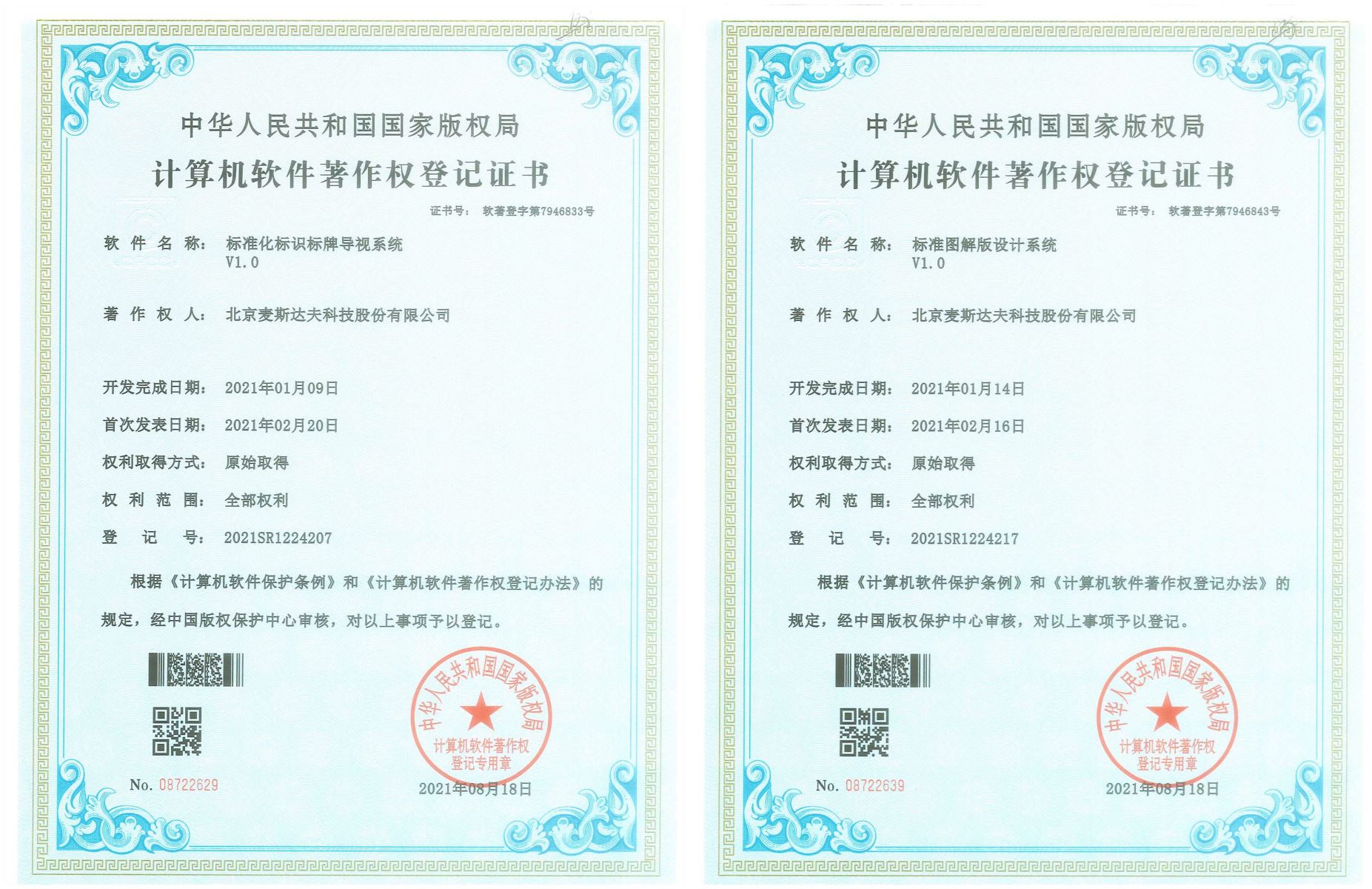 2021年8月18日,北京麥斯達(dá)夫科技股份有限公司獲得兩項(xiàng)軟件著作權(quán)證書,“標(biāo)準(zhǔn)化標(biāo)識(shí)標(biāo)牌導(dǎo)視系統(tǒng)”和“標(biāo)準(zhǔn)圖解版設(shè)計(jì)系統(tǒng)”。