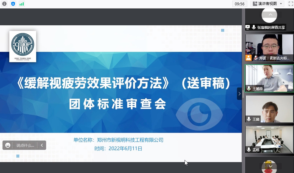 2022年6月11日,中國民族貿(mào)易促進(jìn)會在北京組織召開OTOP團(tuán)體標(biāo)準(zhǔn)《護(hù)眼產(chǎn)品緩解視疲勞效果評價方法》專家審查會,會議以線上形式召開。來自中國輕工業(yè)聯(lián)合會、中國民族貿(mào)易促進(jìn)會、北京同仁醫(yī)院、北京茗視光眼科醫(yī)院、鄭州人民醫(yī)院鄭東院區(qū)的5名專家組成標(biāo)準(zhǔn)評審專家組。標(biāo)準(zhǔn)主編單位鄭州市新視明科技工程有限公司總經(jīng)理張秋霞出席會議,河南省眼健康產(chǎn)品工程技術(shù)研究中心主任曹萌雅、檢測主任秦艷榮、研發(fā)工程師崔宇峰參加會議。