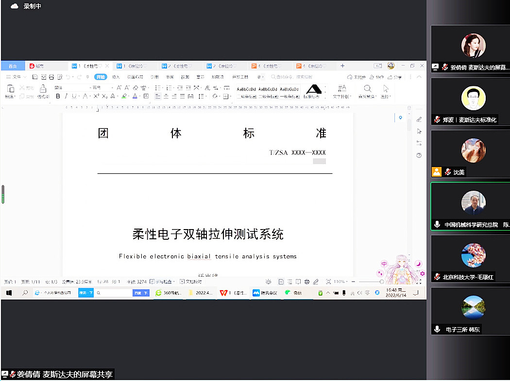 2022年6月14日,中關(guān)村標(biāo)準(zhǔn)化協(xié)會以線上會議形式召開中關(guān)村標(biāo)準(zhǔn)《柔性電子雙軸拉伸測試儀》《原位冷熱臺》專家審查會。來自中國機(jī)械科學(xué)研究總院、北京科技大學(xué)、中國電子科技集團(tuán)公司第三研究所、北京市計(jì)量檢測科學(xué)研究院、賽迪集團(tuán)等單位的專家組成標(biāo)準(zhǔn)評審專家組。標(biāo)準(zhǔn)主編單位北京中聚高科科技有限公司技術(shù)工程師張建亮參加會議并陳述答辯。