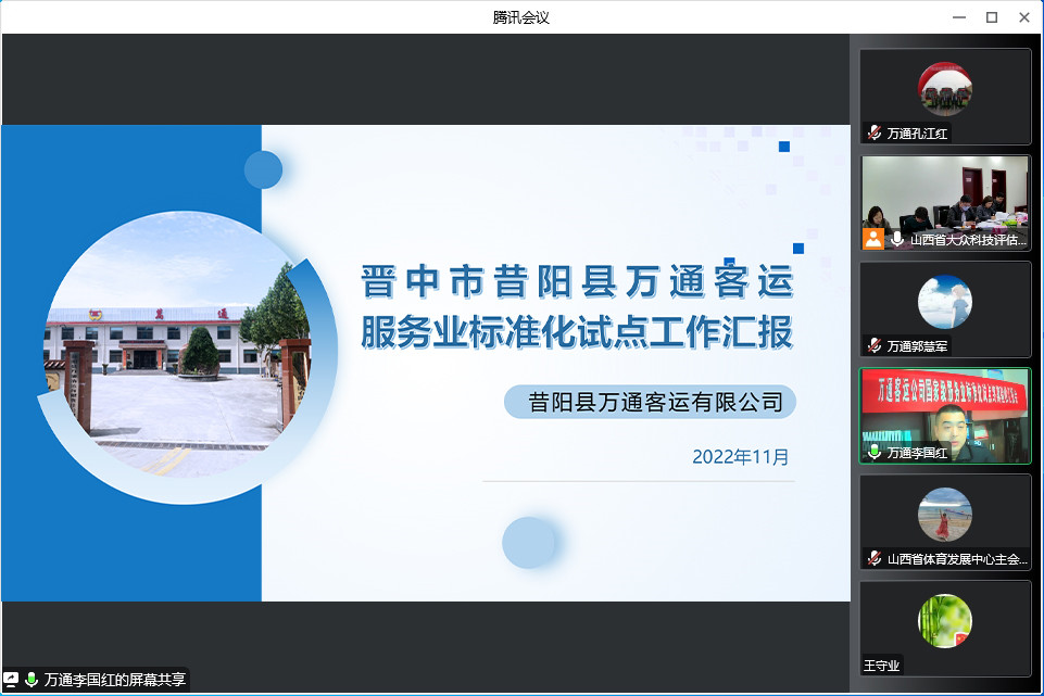 2022年11月18日,晉中市昔陽縣萬通客運服務業(yè)標準化試點終期驗收評估會以網(wǎng)絡會議形式召開。山西省市場監(jiān)督管理局標準管理處處長王守業(yè)、二級調(diào)研員秦忠武帶隊,來自山西省社會科學院、山西省檢驗檢測中心、中國(山西)知識產(chǎn)權保護中心、中國標準化研究院、山西省標準計量技術研究院的五位專家組成評估專家組。晉中市市場監(jiān)督管理局標準化協(xié)調(diào)推進管理科科長尹志鵬,昔陽縣市場監(jiān)督管理局副局長田志兵、縣客運辦主任孔德峰,萬通客運有限公司經(jīng)理尹鵬軍出席會議。