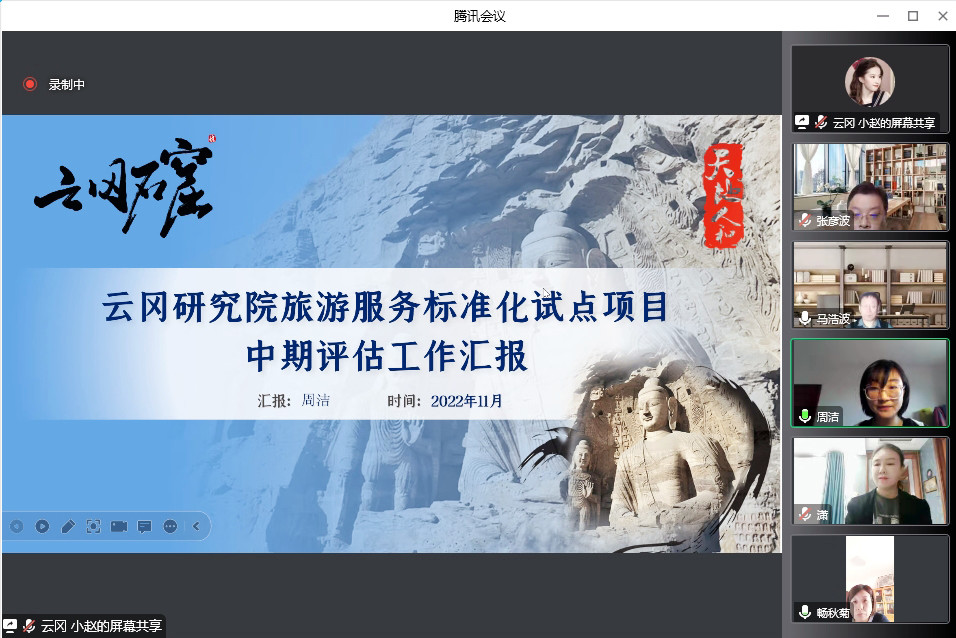 2022年11月29日,大同市云岡石窟研究院旅游服務(wù)標(biāo)準(zhǔn)化試點(diǎn)中期驗(yàn)收評估會以網(wǎng)絡(luò)會議形式召開。山西省市場監(jiān)督管理局標(biāo)準(zhǔn)管理處處長王守業(yè)、二級調(diào)研員秦忠武帶隊(duì),來自山西省社會科學(xué)院、山西省檢驗(yàn)檢測中心、中國(山西)知識產(chǎn)權(quán)保護(hù)中心、山西省標(biāo)準(zhǔn)計(jì)量技術(shù)研究院等單位的專家組成評估專家組。云岡研究院黨委委員、文旅融合發(fā)展中心主任崔曉霞,大同市市場監(jiān)督管理局標(biāo)準(zhǔn)化科科長高峻峰、副科長卜隆,大同市文化和旅游標(biāo)準(zhǔn)化技術(shù)委員會秘書長王雪妮等出席會議。