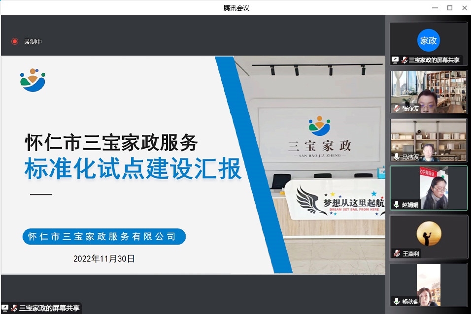 2022年11月30日,懷仁市三寶家政服務(wù)標(biāo)準(zhǔn)化試點(diǎn)中期驗(yàn)收評(píng)估會(huì)以網(wǎng)絡(luò)會(huì)議形式召開(kāi)。山西省市場(chǎng)監(jiān)督管理局標(biāo)準(zhǔn)管理處處長(zhǎng)王守業(yè)、二級(jí)調(diào)研員秦忠武帶隊(duì),來(lái)自山西省社會(huì)科學(xué)院、山西省檢驗(yàn)檢測(cè)中心、中國(guó)(山西)知識(shí)產(chǎn)權(quán)保護(hù)中心、山西省標(biāo)準(zhǔn)計(jì)量技術(shù)研究院等單位的專(zhuān)家組成評(píng)估專(zhuān)家組。朔州市市場(chǎng)監(jiān)督管理局標(biāo)準(zhǔn)化科科長(zhǎng)徐麗花,懷仁市市場(chǎng)監(jiān)督管理局黨組成員王肇清,懷仁市三寶家政服務(wù)有限公司董事長(zhǎng)張文玲、總經(jīng)理白世杰等出席會(huì)議。