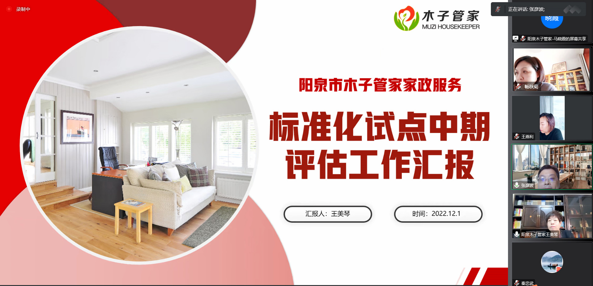 2022年12月1日,陽(yáng)泉市木子管家家政服務(wù)標(biāo)準(zhǔn)化試點(diǎn)中期驗(yàn)收評(píng)估會(huì)以網(wǎng)絡(luò)會(huì)議形式召開(kāi)。山西省市場(chǎng)監(jiān)督管理局標(biāo)準(zhǔn)管理處處長(zhǎng)王守業(yè)、二級(jí)調(diào)研員秦忠武帶隊(duì),來(lái)自山西省社會(huì)科學(xué)院、山西省檢驗(yàn)檢測(cè)中心、中國(guó)(山西)知識(shí)產(chǎn)權(quán)保護(hù)中心、山西省標(biāo)準(zhǔn)計(jì)量技術(shù)研究院等單位的專(zhuān)家組成評(píng)估專(zhuān)家組。陽(yáng)泉市市場(chǎng)監(jiān)督管理局副局長(zhǎng)劉建民、標(biāo)準(zhǔn)化協(xié)調(diào)推進(jìn)科科長(zhǎng)劉淑嫻、標(biāo)準(zhǔn)管理科科長(zhǎng)傅江出席會(huì)議,陽(yáng)泉木子管家家政服務(wù)有限公司總經(jīng)理王美琴參加會(huì)議并作試點(diǎn)建設(shè)匯報(bào)。