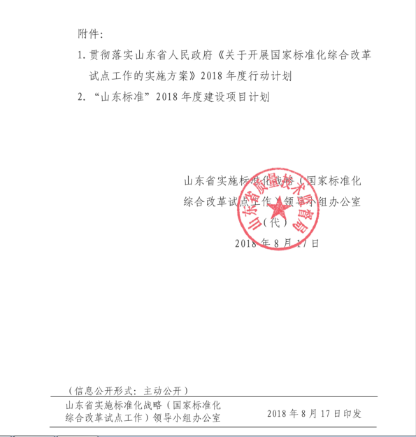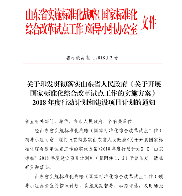 貫徹落實山東省人民政府《關于開展國家標準化綜合改革試點工作的實施方案》2018 年度行動計劃為認真落實《山東省人民政府印發(fā)關于開展國家標準化綜合改革試點工作的實施方案的通知》(魯政字〔2018〕125 號,以下簡稱《實施方案》)的要求,按照突出重點、急用先行,三年目標任務分年度推進實施的原則,進一步明確 2018 年度各級各部門的工作任務、目標責任和時間進度,制定本行動計劃。