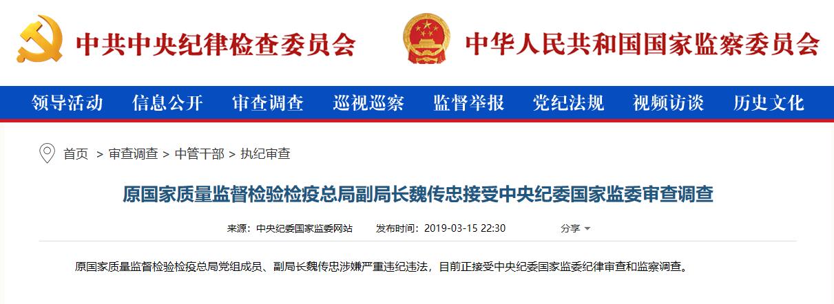 中央紀(jì)委國家監(jiān)委網(wǎng)站2019年3月15日22點30分發(fā)布消息稱,“原國家質(zhì)量監(jiān)督檢驗檢疫總局黨組成員、副局長魏傳忠涉嫌嚴(yán)重違紀(jì)違法,目前正接受中央紀(jì)委國家監(jiān)委紀(jì)律審查和監(jiān)察調(diào)查。”