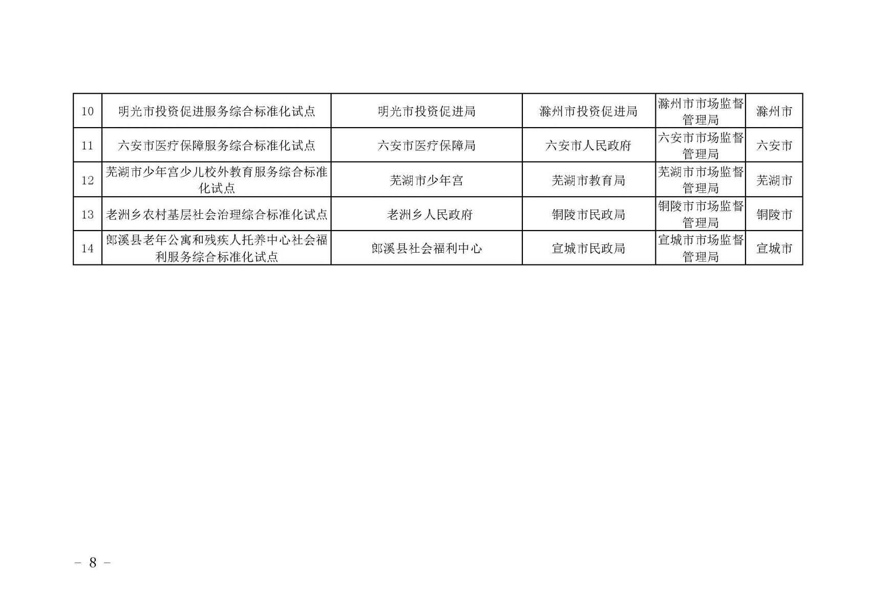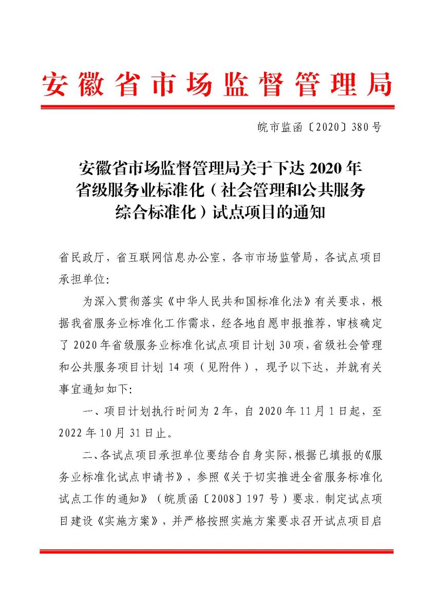 安徽省市場(chǎng)監(jiān)督管理局關(guān)于下達(dá)2020年省級(jí)服務(wù)業(yè)標(biāo)準(zhǔn)化(社會(huì)管理和公共服務(wù)綜合標(biāo)準(zhǔn)化)試點(diǎn)項(xiàng)目的通知