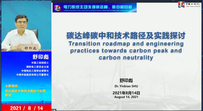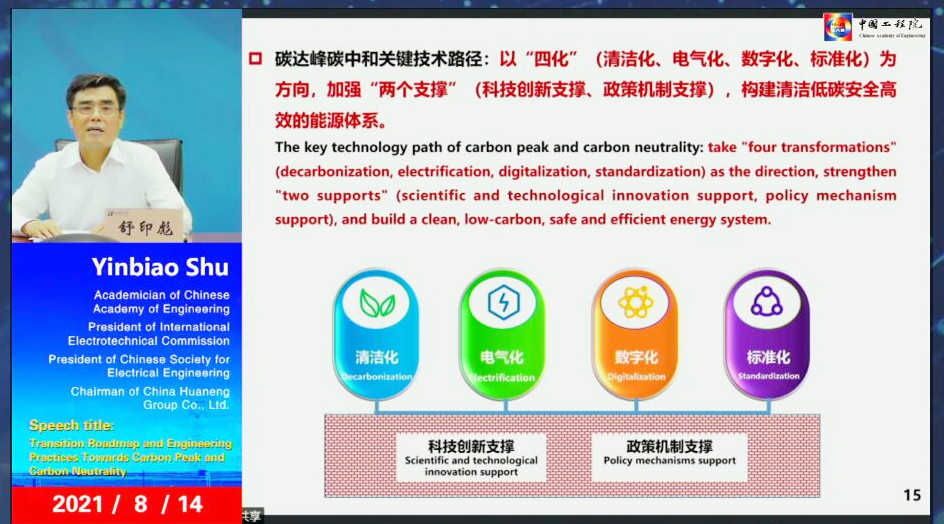 8月14日,在2021年中國工程院國際工程科技發(fā)展戰(zhàn)略高端論壇暨第六屆紫金論電國際學(xué)術(shù)研討會上,國際電工委員會(IEC)主席、中國電機工程學(xué)會理事長、中國華能集團有限公司董事長舒印彪院士發(fā)表題為“碳達峰碳中和技術(shù)路徑及實踐探討”的主旨報告。