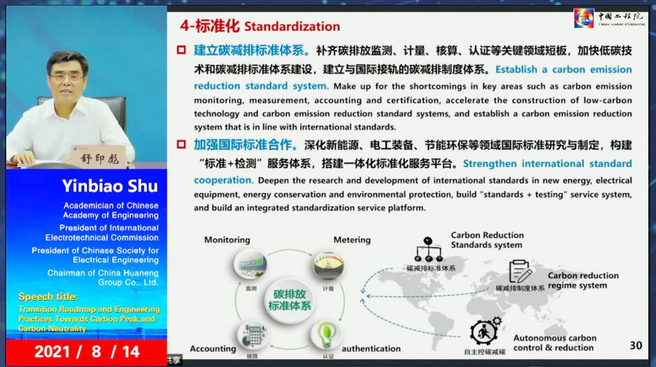 在“四化”中的標準化方向,舒印彪院士提出,一是要“建立碳減排標準體系。補齊碳排放監(jiān)測、計量、核算、認證等關(guān)鍵領(lǐng)域短板,加快低碳技術(shù)和碳減排標準體系建設(shè),建立與國際接軌的碳減排制度體系。”二是要“加強國際標準合作。深化新能源、電工裝備、節(jié)能環(huán)保等領(lǐng)域國際標準研究與制定,構(gòu)建‘標準+檢測’服務(wù)體系,搭建一體化標準化服務(wù)平臺。”