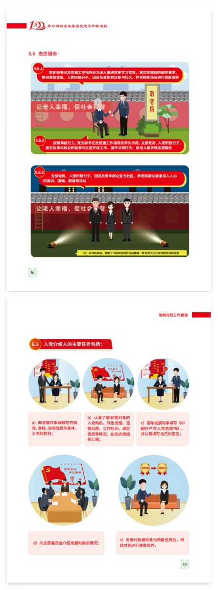本書主體章節(jié)由九個(gè)標(biāo)準(zhǔn)圖解版組成,分別是“第一章‘三會(huì)一課’工作規(guī)范”“第二章 主題黨日活動(dòng)策劃規(guī)范”“第三章 黨支部孵化工作規(guī)范”“第四章 發(fā)展黨員工作規(guī)范”“第五章 黨員自我提升規(guī)程”“第六章 流動(dòng)黨員管理規(guī)范”“第七章 黨員之家管理規(guī)范”“第八章 黨建指導(dǎo)員工作規(guī)范”“第九章 黨建工作與企業(yè)發(fā)展融合指南”。這九個(gè)標(biāo)準(zhǔn)是從麥斯達(dá)夫標(biāo)準(zhǔn)化事務(wù)所自主研發(fā)的“非公企業(yè)黨建工作標(biāo)準(zhǔn)體系”中篩選出的精中之精,凸顯非公特色、使用頻率較高、便于推廣應(yīng)用,為非公有制企業(yè)開展黨建工作提供了可借鑒、可復(fù)制、可操作的做法和經(jīng)驗(yàn)。
