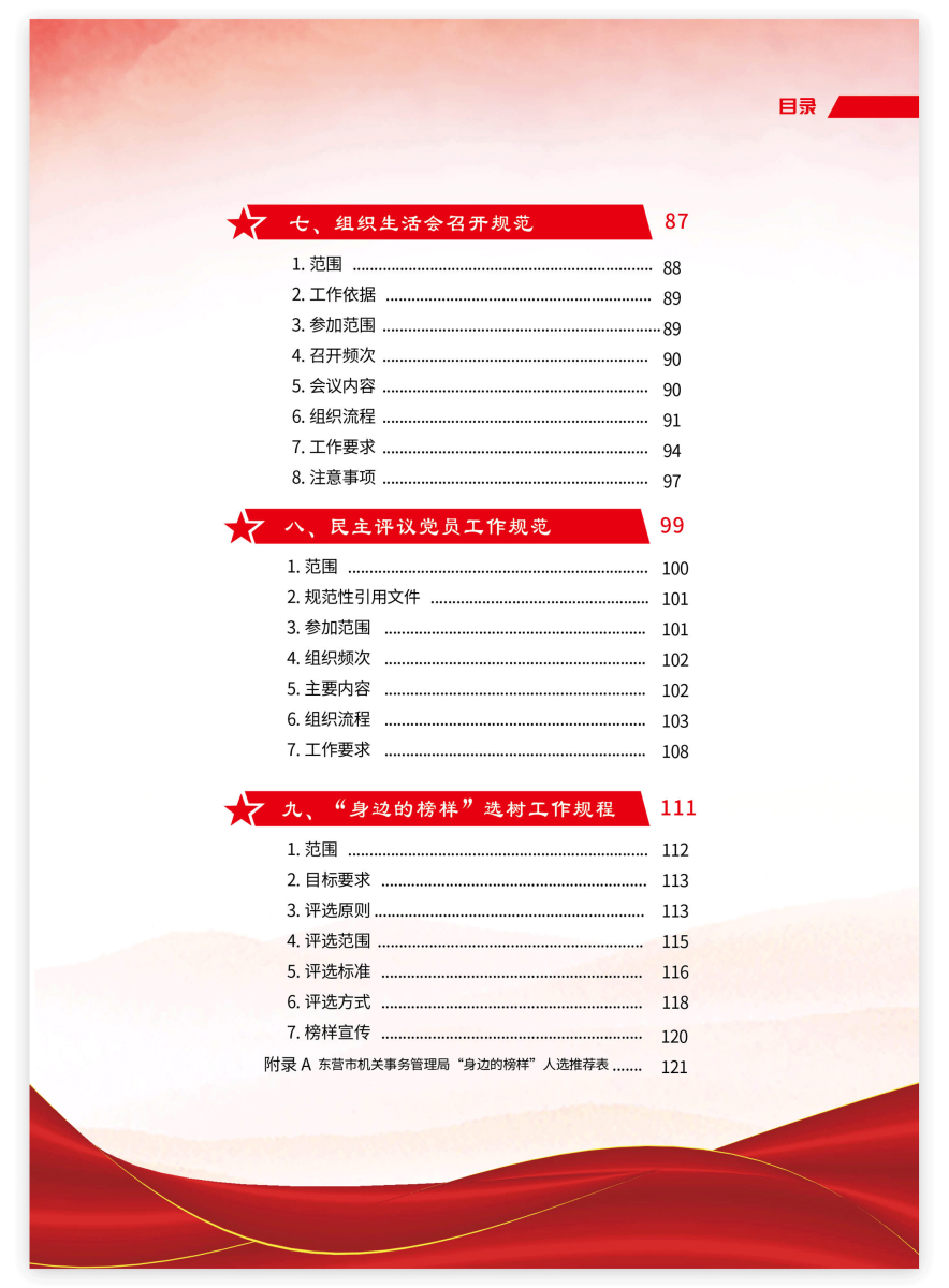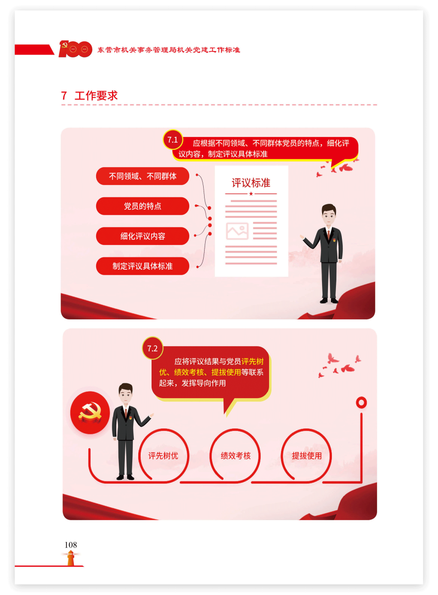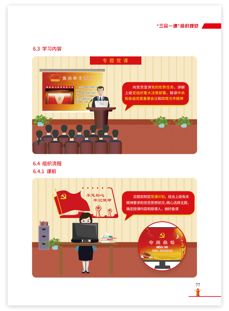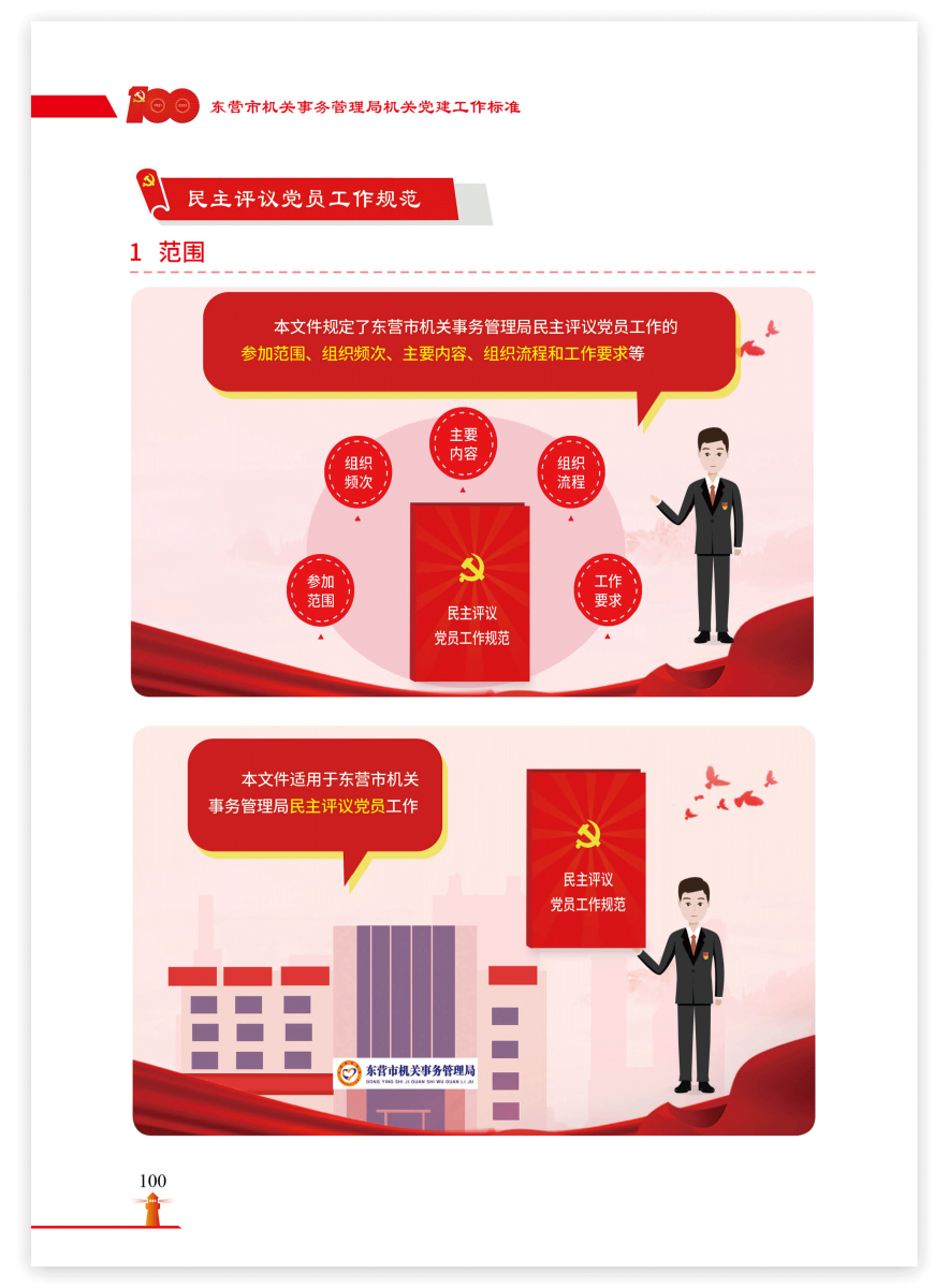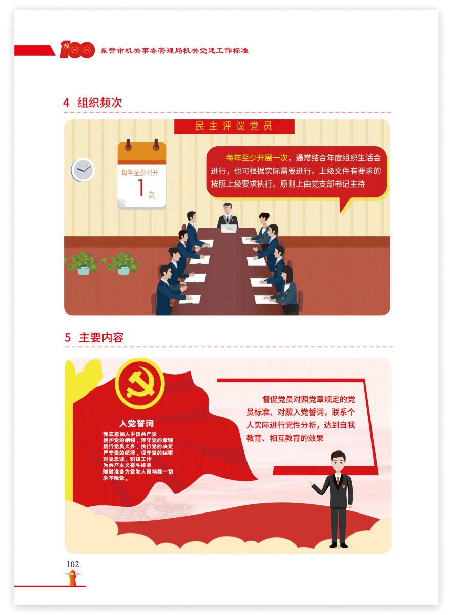 《東營(yíng)市機(jī)關(guān)事務(wù)管理局機(jī)關(guān)黨建工作標(biāo)準(zhǔn)》(圖解版)系統(tǒng)梳理了機(jī)關(guān)黨建工作的規(guī)章制度,把機(jī)關(guān)黨建工作的內(nèi)容、要求、流程都以標(biāo)準(zhǔn)的形式固定下來(lái)。全書涵蓋了黨組理論學(xué)習(xí)中心組學(xué)習(xí)、黨組織書記抓基層黨建述職評(píng)議考核、機(jī)關(guān)黨建換屆選舉、黨員發(fā)展、“三會(huì)一課”、主題黨日活動(dòng)、組織生活會(huì)、民主評(píng)議黨員、“身邊的榜樣”選樹等九個(gè)方面的工作,既包含了機(jī)關(guān)黨建的規(guī)定動(dòng)作,也在黨建工作與業(yè)務(wù)工作融合上進(jìn)行了初步探索,供黨建工作者學(xué)習(xí)參考。全書以“標(biāo)準(zhǔn)圖解版”的形式呈現(xiàn),一共繪制了242張圖片,每一個(gè)場(chǎng)景、每一個(gè)細(xì)小元素均經(jīng)過(guò)精心設(shè)計(jì)。