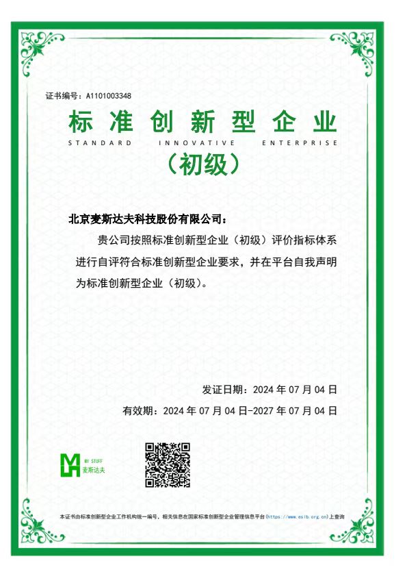 北京麥斯達夫科技股份有限公司獲評標準創(chuàng)新型企業(yè)