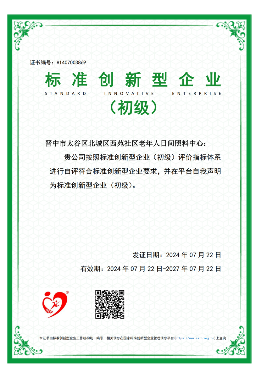 晉中市太谷區(qū)北城區(qū)西苑社區(qū)老年人日間照料中心獲評標(biāo)準(zhǔn)創(chuàng)新型企業(yè)