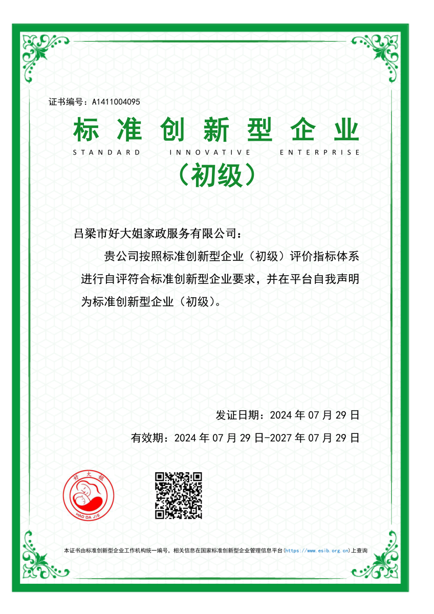 呂梁市好大姐家政服務(wù)有限公司獲評標(biāo)準(zhǔn)創(chuàng)新型企業(yè)