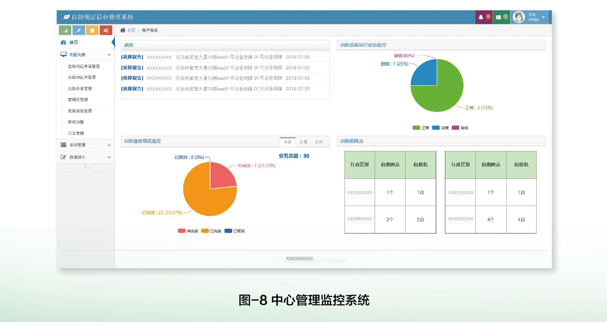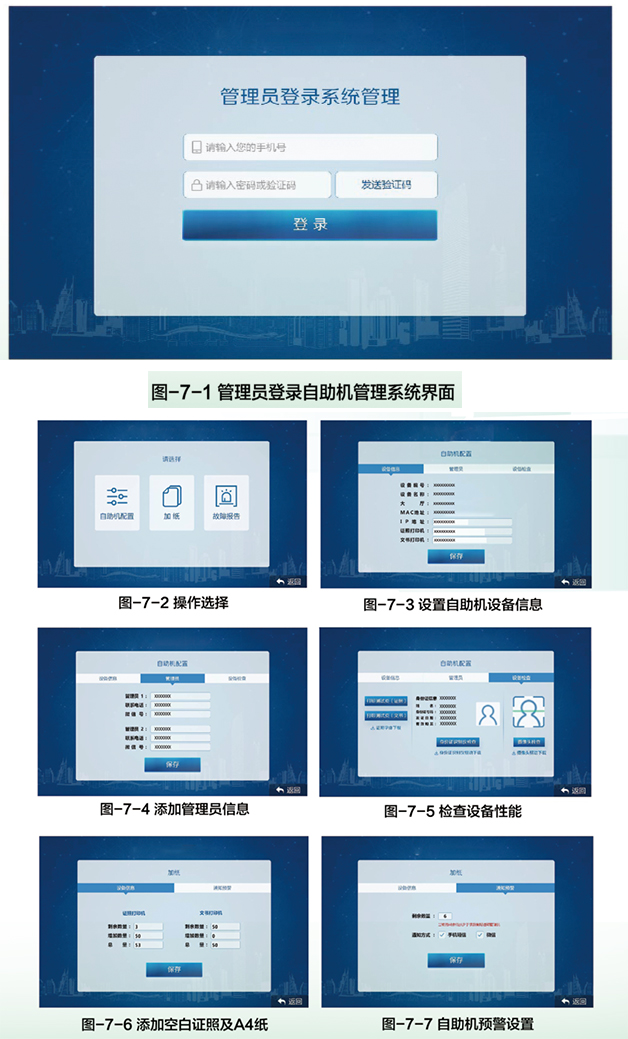 每臺自助領(lǐng)照機(jī)需要大廳配備至少—名管理人員,管理員通過個人微信登錄自助機(jī)管理系統(tǒng)完成自助機(jī)的日常管理和維護(hù)工作。自助機(jī)管理系統(tǒng)主要提供自助機(jī)網(wǎng)絡(luò)安全配置、日??瞻鬃C照和紙張管理、缺紙預(yù)警提醒、設(shè)備故障檢測等功能,設(shè)備故障時可通過該系統(tǒng)發(fā)送故障報告,求助中心技術(shù)人員維修處理,系統(tǒng)界面如圖-7-1至圖-7-7所示。