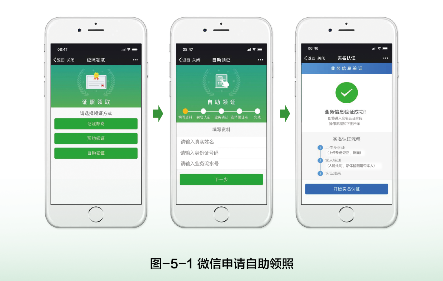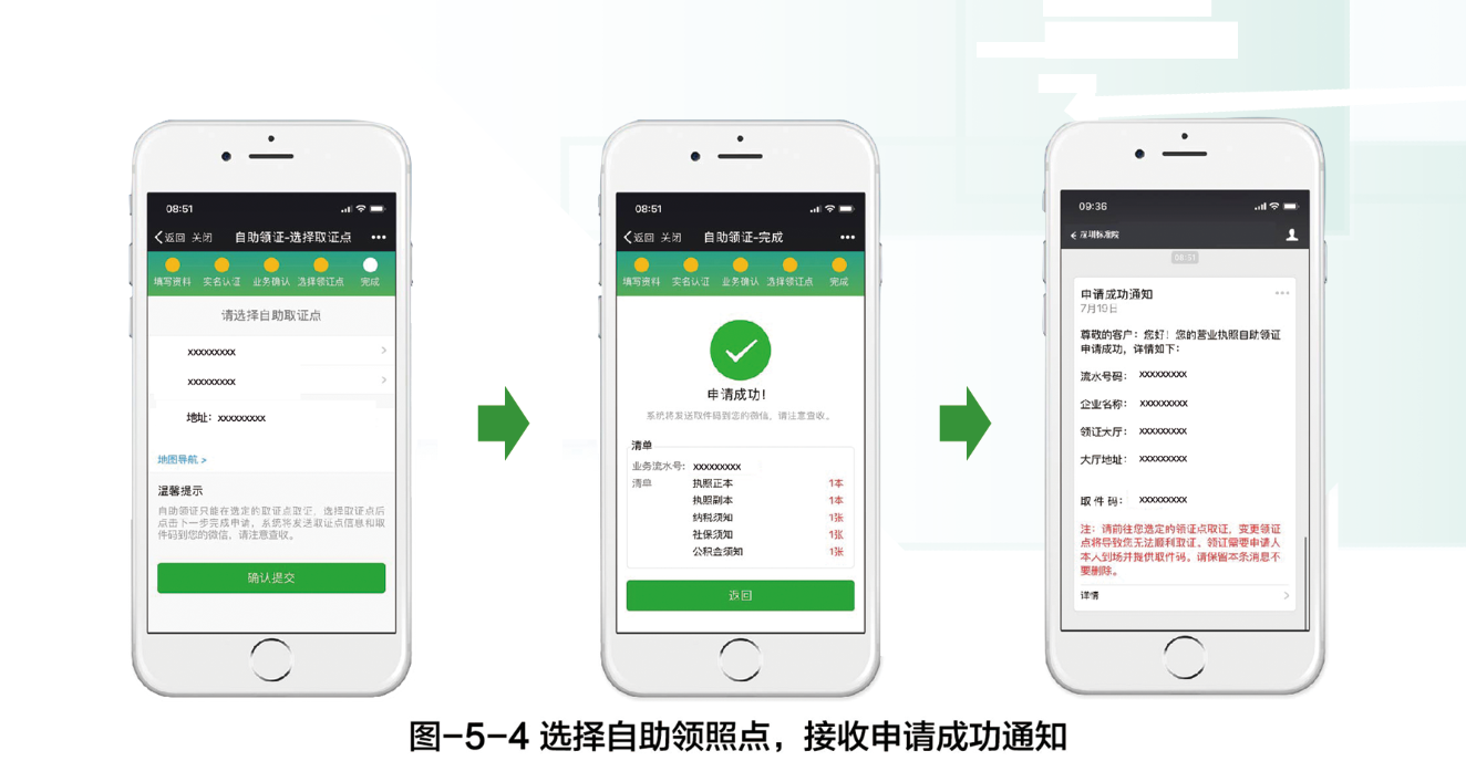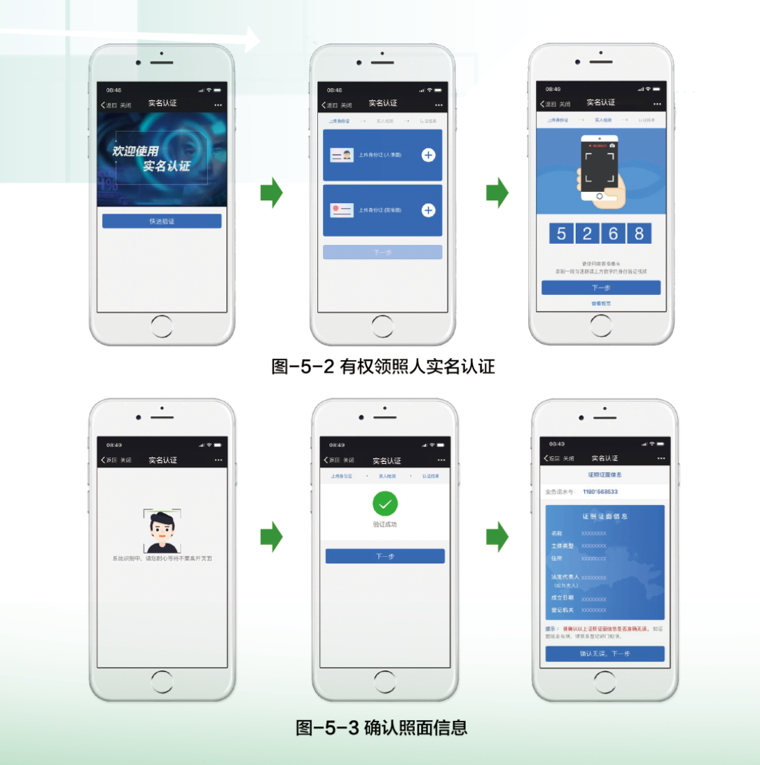 有權(quán)領(lǐng)照人通過微信端申請系統(tǒng)完成自助領(lǐng)照申請,系統(tǒng)界面如圖-5-1至圖-5-4所示。申請時需在系統(tǒng)中完成業(yè)務(wù)信息驗證、實名認(rèn)證、照面信息確認(rèn)和自助領(lǐng)照點的選擇,申請?zhí)峤怀晒?,系統(tǒng)將通過微信消息將自助領(lǐng)照點地址和取證碼等信息發(fā)送給申請人。