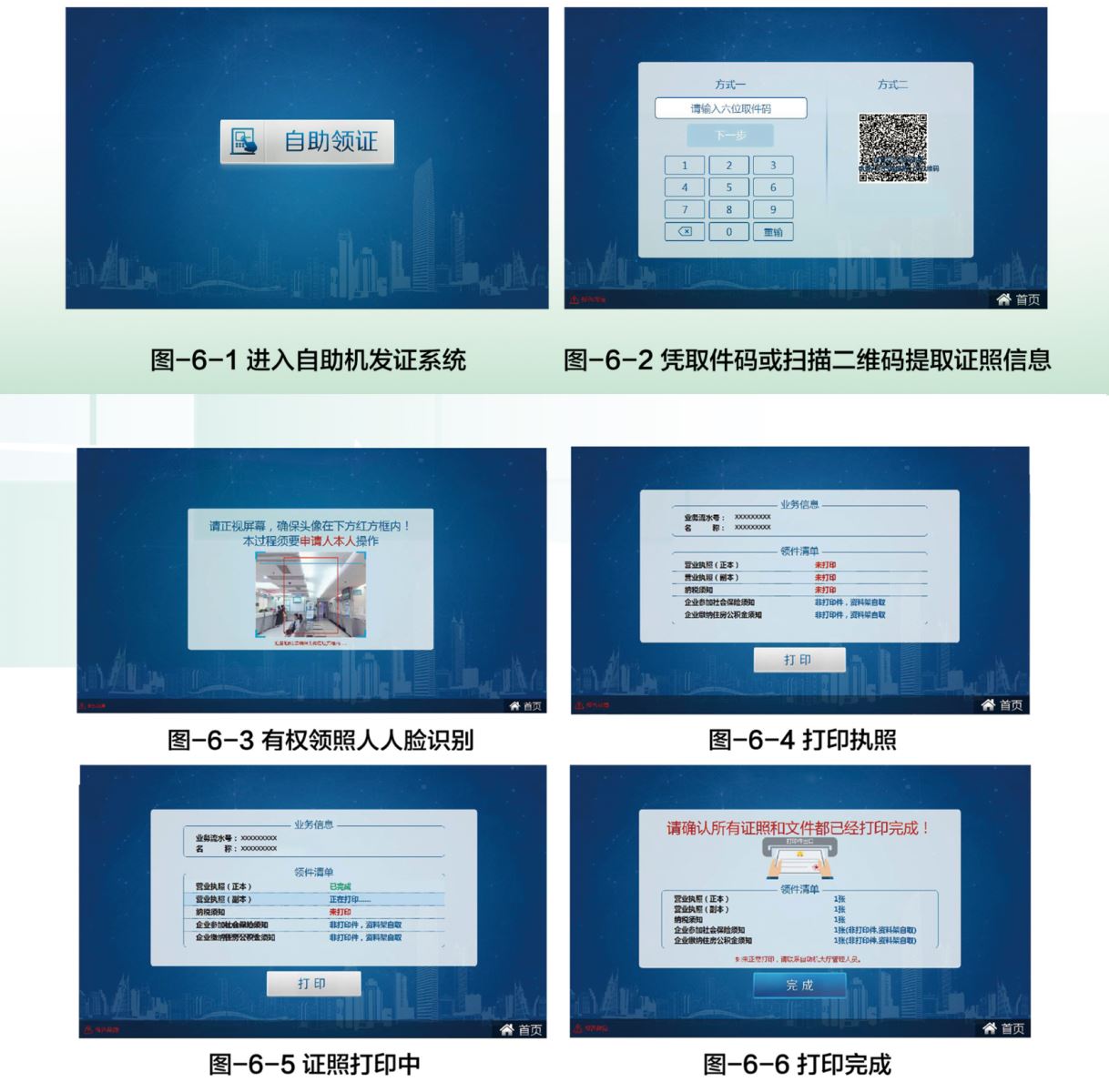 申請人通過自助機(jī)領(lǐng)照系統(tǒng)完成領(lǐng)照,系統(tǒng)界面如圖-6-1至圖-6-6所示。成功申請自助領(lǐng)照的申請人到達(dá)選定的自助領(lǐng)照點,輸入正確的取件碼或通過微信掃描自助機(jī)屏幕二維碼,通過人臉識別驗證,即可調(diào)取相應(yīng)業(yè)務(wù)信息及待打印的證件清單,點擊打印按鈕開始自助打證。